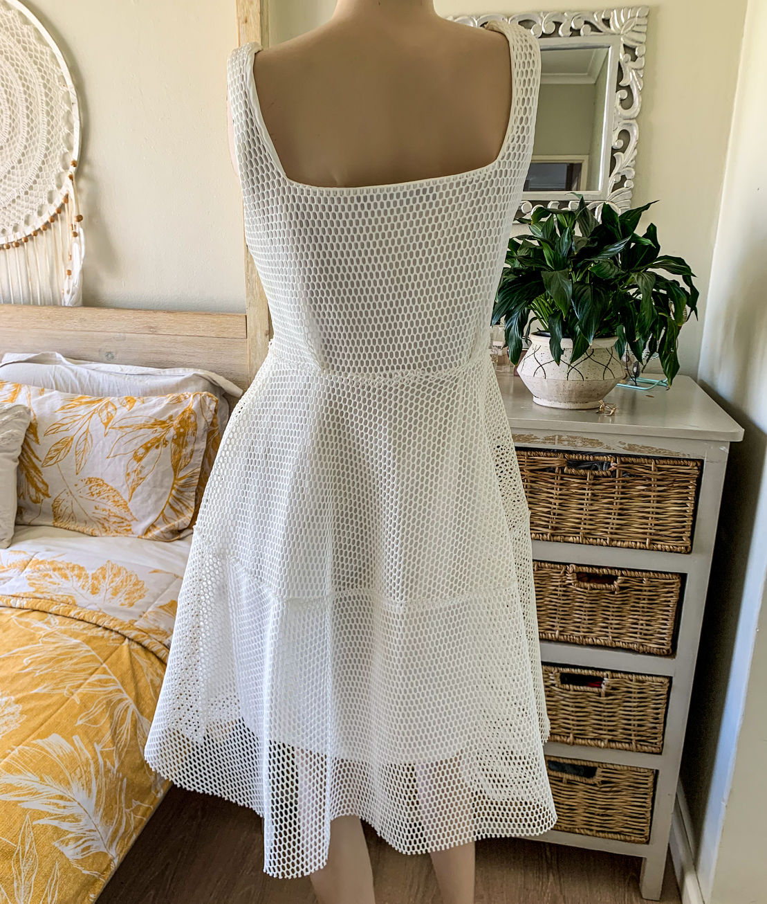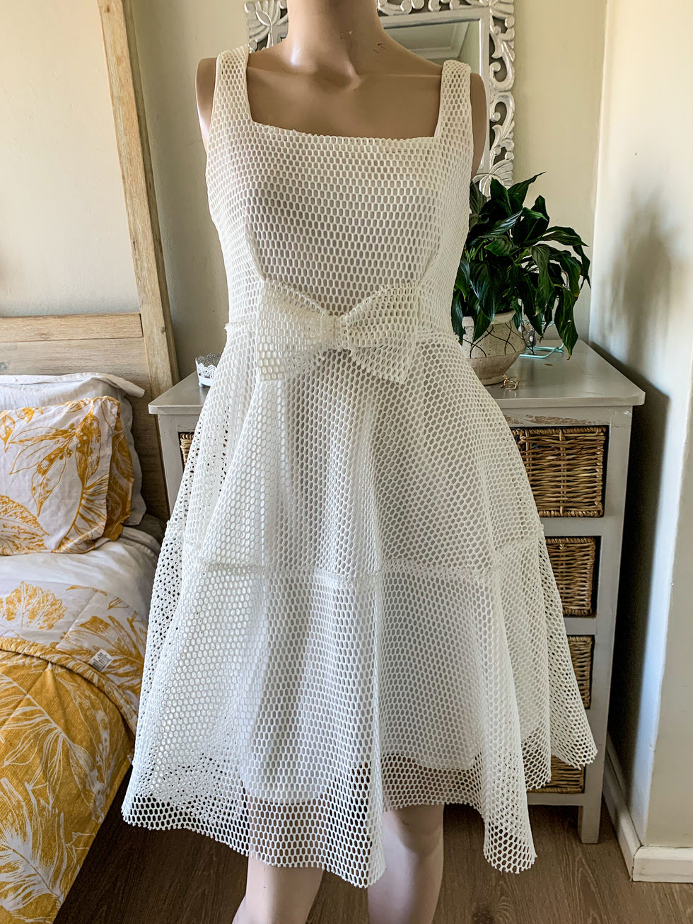 Light and pretty A-line swing dress in soft white mesh. Features a sweet bow detail just below the bust and finishes just above the knee. Feminine, flowy, and perfect for warm days or special occasions. Fits like a medium.