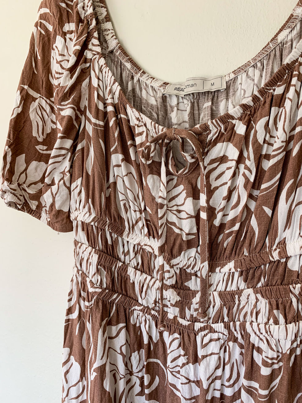 BROWN FLORAL MIDI SUMMER DRESS – SIZE MEDIUM – REAL CLOTHING – 100% VISCOSE