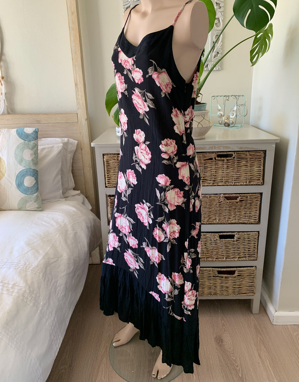 Romantic and breezy, this black midi dress with pink floral print features a hi-lo hemline, ruffled lower tier, and spaghetti straps with a side zip for ease. Though labelled XL, the fit is best suited to a medium to large. An unbranded find with fairytale charm.
