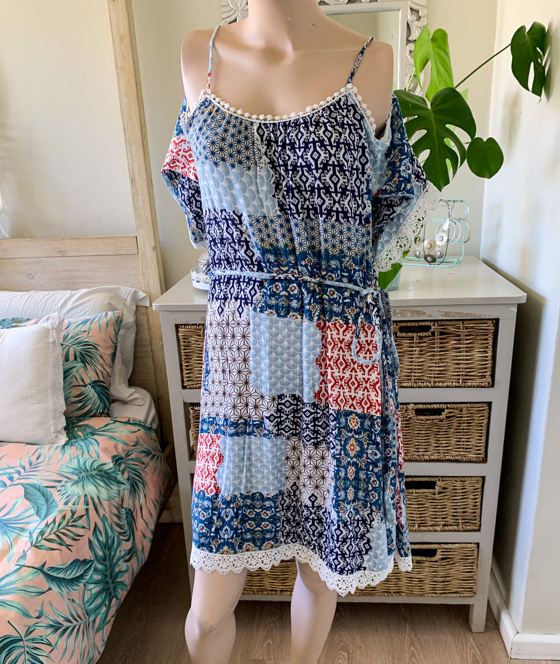 BLUE & RED PATCHWORK COLD-SHOULDER MIDI – SIZE 28 (TRUWORTHS)