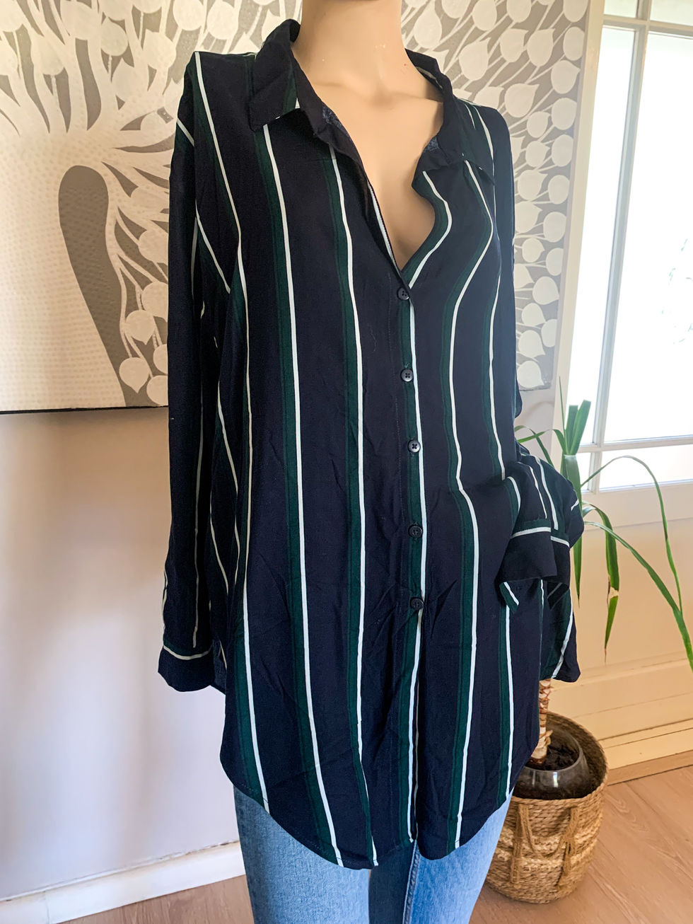 Oversized, longer-length button-down shirt from Papaya in navy green and white. Made from soft cotton, relaxed and flowy for a comfortable fit. Size 20. R245