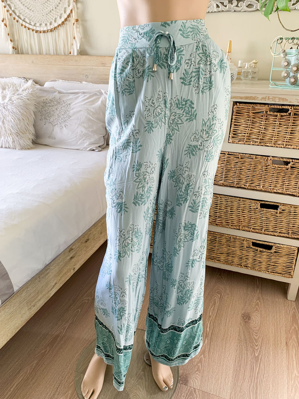 Teal Viscose Palazzo Pants (Size M) – Breezy and bold with a tropical leaf print. Light, flowy, and finished with a chic front-tie detail.