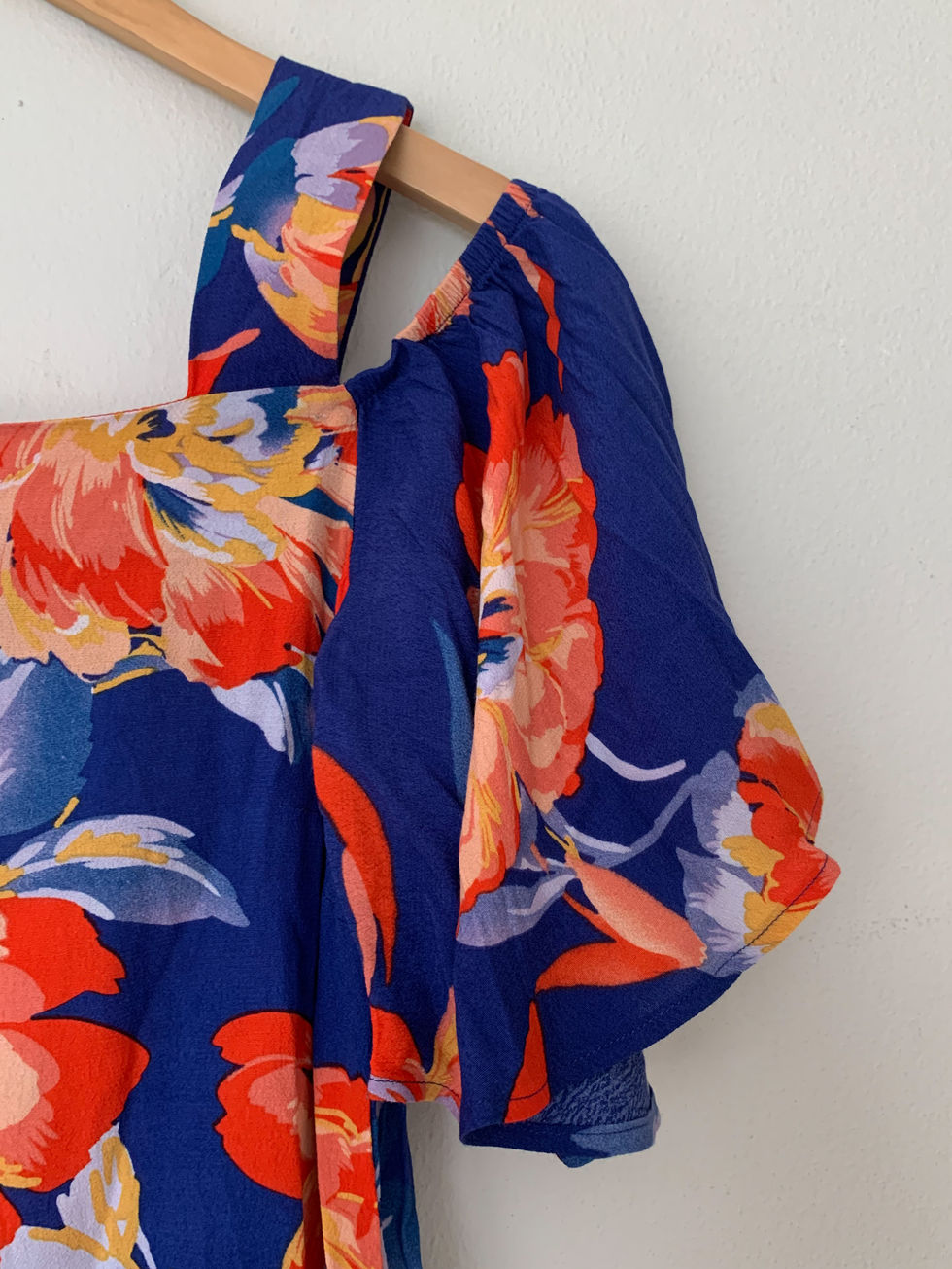 Flowy and feminine, this blue floral blouse by POETRY features a subtle cold shoulder detail and a soft viscose-rayon blend. A lightweight, gently pre-loved piece that adds effortless charm to any wardrobe.
