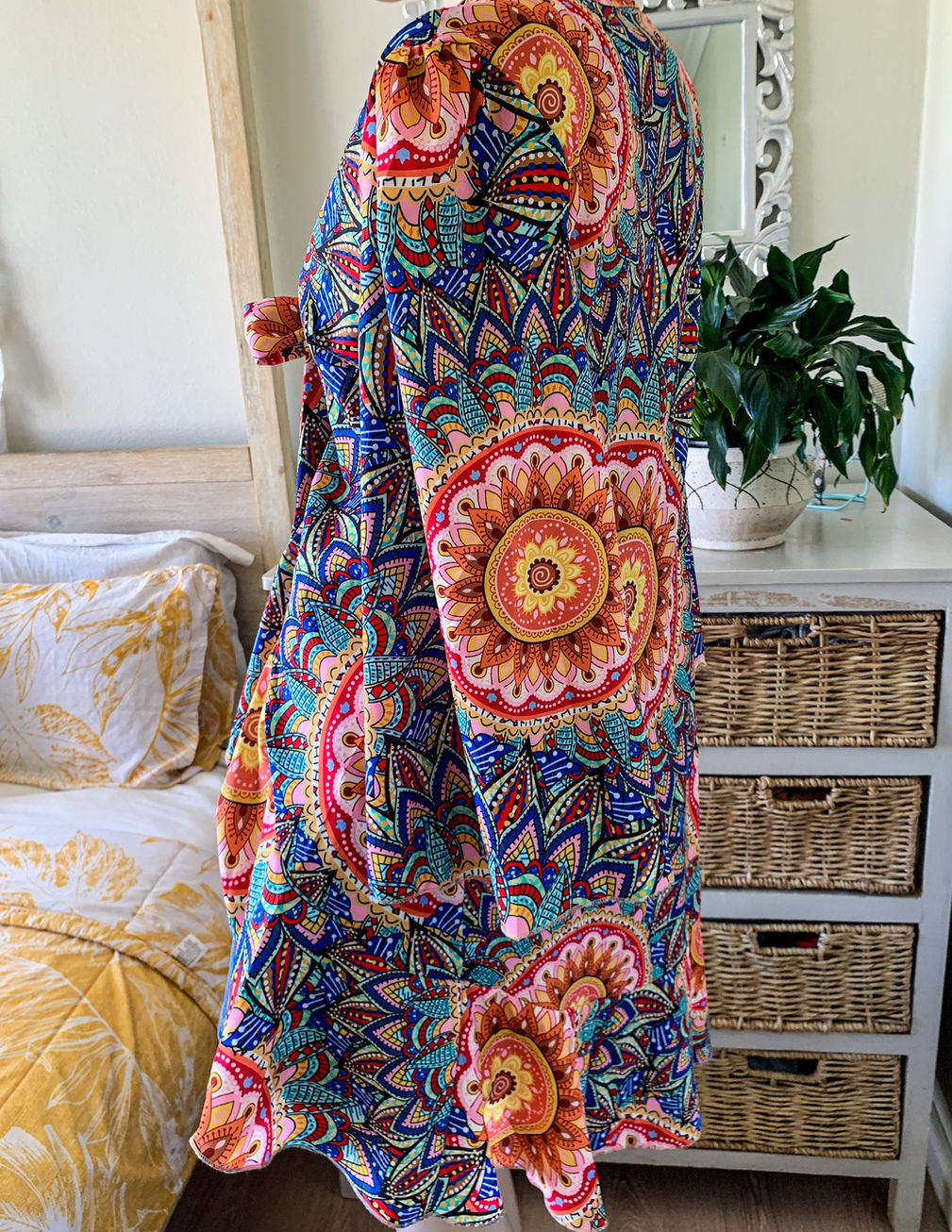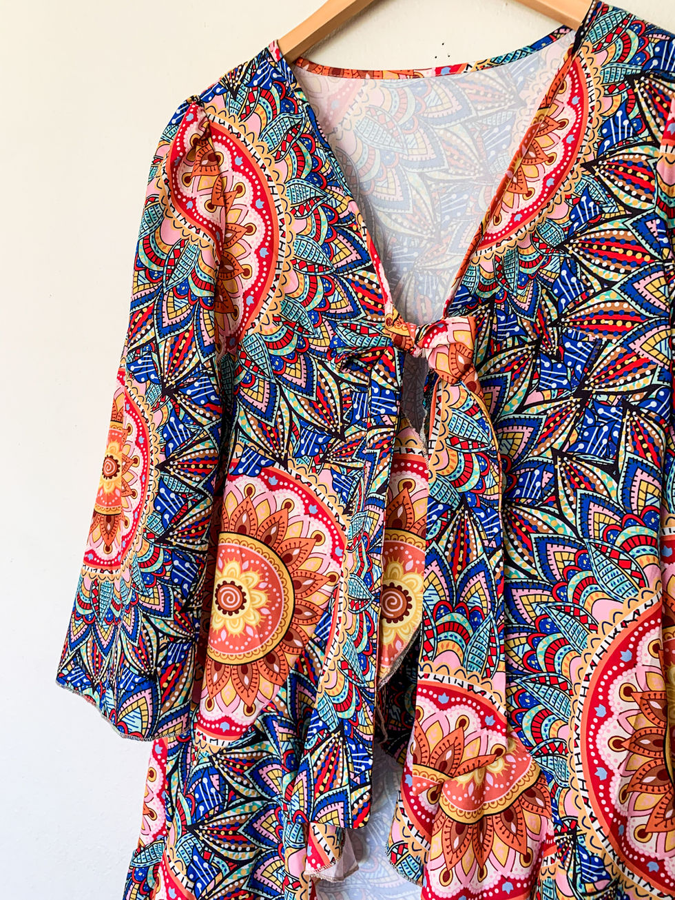 Light and dreamy ruffle duster top in a vibrant, sunset-inspired colour palette. Features a front tie at the bust and a soft, flowy fit. Perfect for layering or beachy evenings. Fits like a medium.