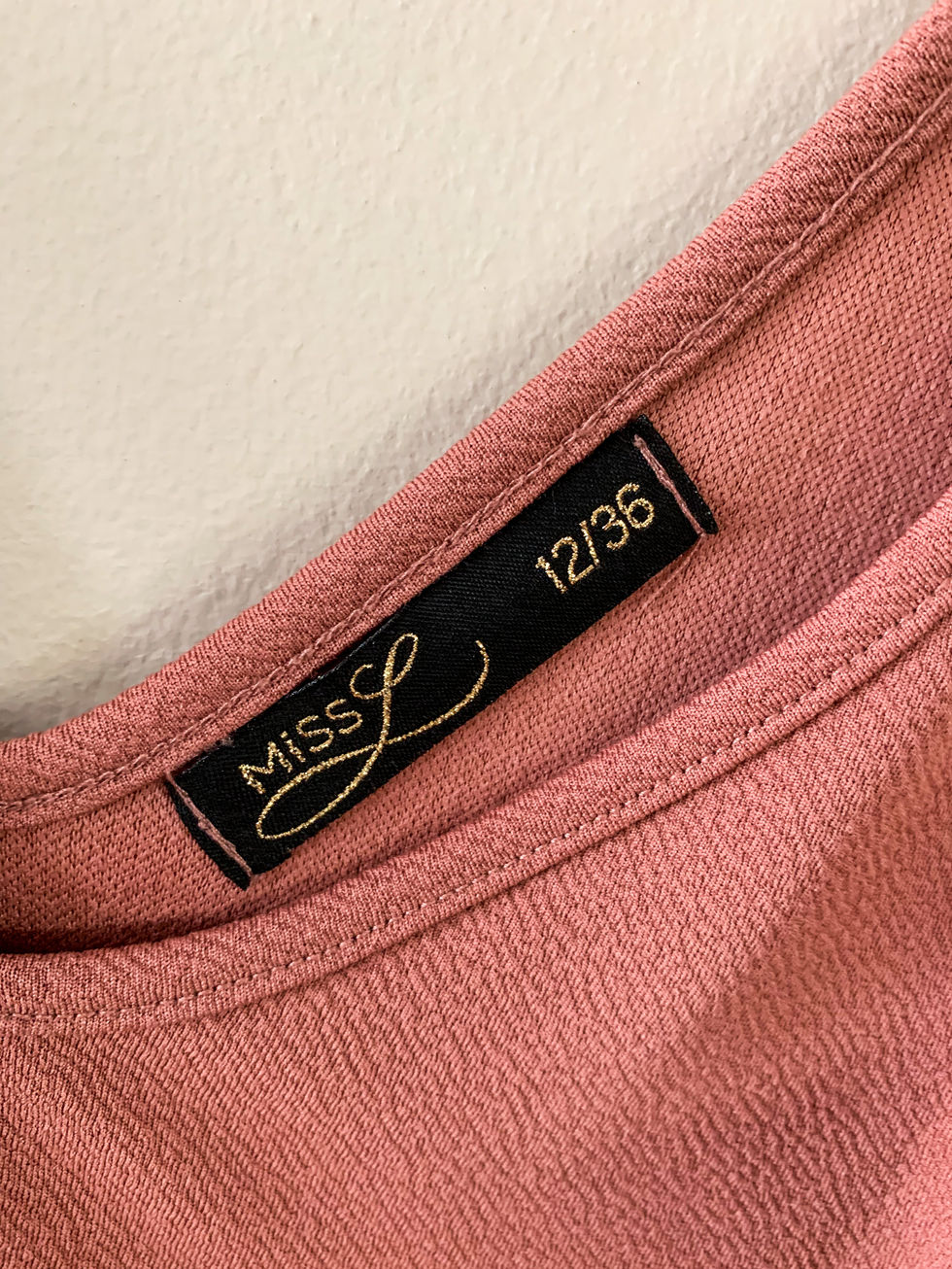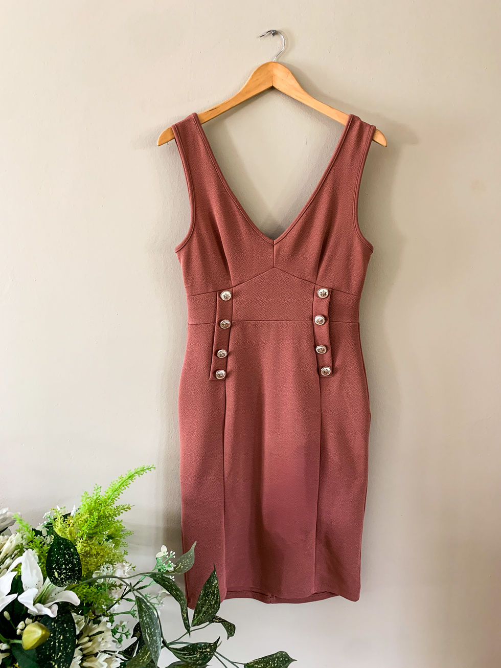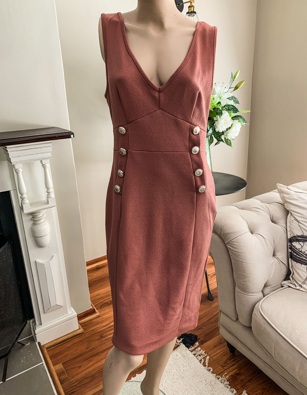 Soft and stylish, this dusty pink shift dress by MISS L features a poly-spandex blend for comfort and stretch. The military-inspired button detailing adds a unique edge, making it a standout piece for any occasion.