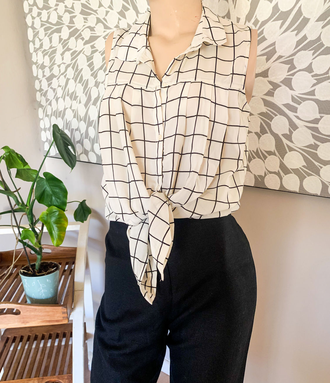 Sleeveless button-down shirt by GMTR in cream with thin black tartan stripes. Sheer, lightweight, and elegant, perfect for layering or a stylish casual look. Size medium. R145
