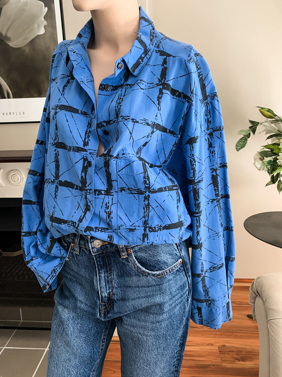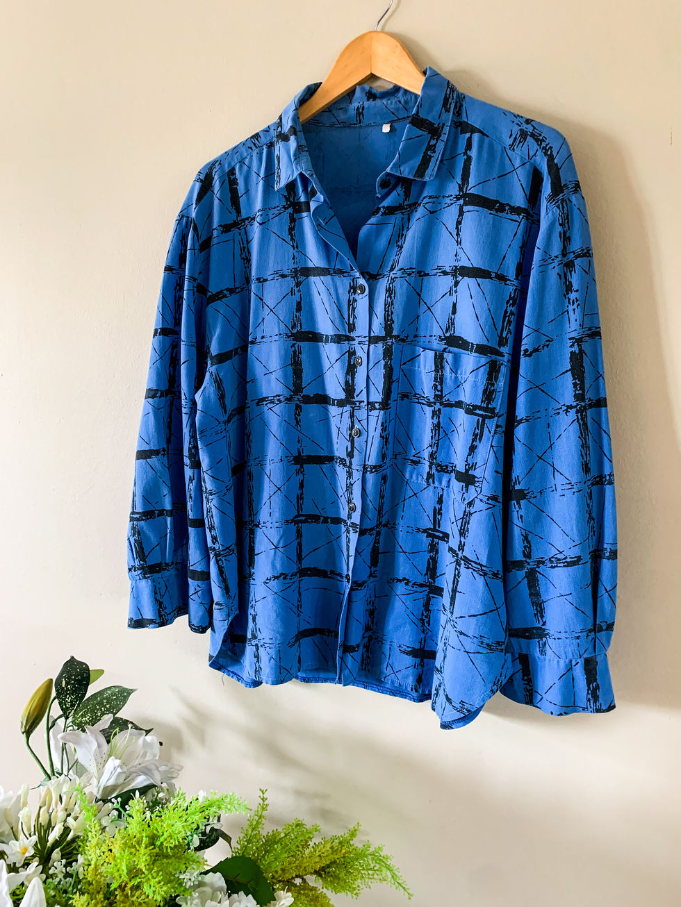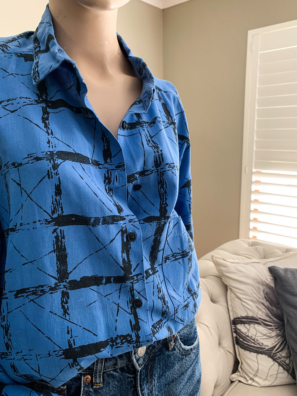 Make a statement with this vintage blue and black graphic shirt, featuring a striking pattern and classic button-down style. In a comfy medium fit, it’s perfect for adding retro flair to your wardrobe—eye-catching, versatile, and effortlessly cool.